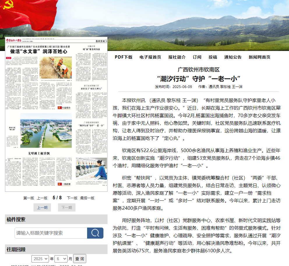 钦南区有522.6公里海岸线,5000余名渔民从事海上养殖和渔业生产。近些年来,钦南区创新实施“潮汐行动”,组建53支党员服务队,奔走在7个沿海乡镇46个渔村,用精细化服务守护渔村“一老一小”。