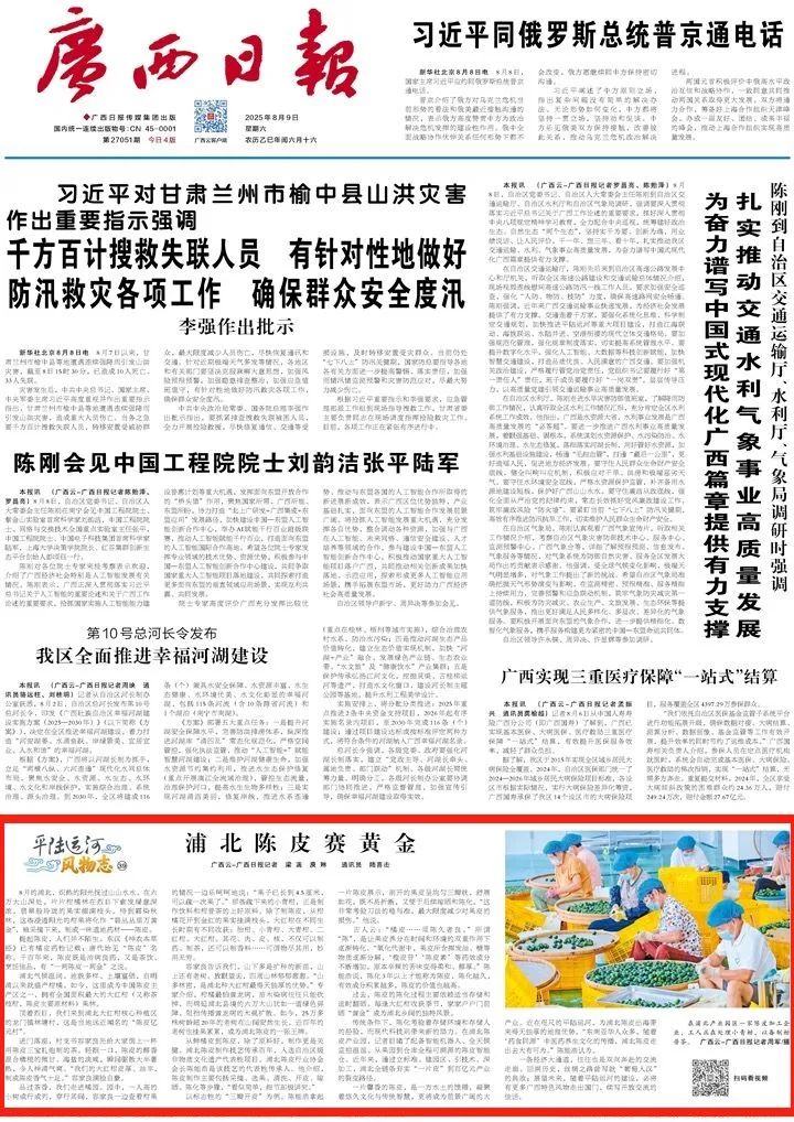 8月的浦北,炽热的阳光抚过山山水水。在六万大山深处,片片柑橘林在烈日下愈发绿意深浓,翡翠般玲珑的果实缀满枝头。待到霜染秋林,这些浸透阳光的柑果将化作“碧丛丛里万黄金”,被采摘下来,制成一味道地药材——陈皮。提起陈皮,人们并不陌生。东汉《神农本草经》已有橘皮药性记载;唐代始见“陈皮”名称。千百年来,陈皮既是治病良药,又是茶饮、烹饪佳品,有“一两陈皮一两金”之说。浦北气候温润、地貌多样、土壤富硒,自明清以来就盛产柑橘。如今,这里成为中国陈皮主产区之一,拥有全国面积最大的大红柑(又称茶枝柑,陈皮主要原材料)果林。顶着烈日,我们来到浦北大红柑核心种植区的龙门镇林塘村,这是当地远近闻名的“陈皮亿元村”。进门落座,村支书容家良先给大家倒上一杯用陈皮三宝扎炮制的茶。轻抿一口,陈皮的醇香混合橄榄的微甘、海盐的淡咸,瞬间驱散大半暑热,令人神清气爽。“我们的大红柑皮厚、油丰,制成陈皮香气十足。”容家良满脸自豪。品过茶香,我们走进橘园。园中,一人高的小树成行成列,穿行其间,容家良一边查看柑果的情况一边乐呵呵地说:“果子已长到4.5厘米,可以疏一次果了。”那些疏下来的小青柑,正是制作饮料和柑普茶的上好原料。除了制陈皮,从柑橘花开到金红的果实挂满枝头,大红柑在不同生长时期有不同收获:胎柑、小青柑、大青柑、二红柑、大红柑。其花、肉、皮、核,不仅可以制药、制茶,还可以制香料……可谓物尽其用,妙用无穷。容家良告诉我们,山下多是扩种的新苗,山上还有老树。放眼望去,四周山林郁郁葱葱。“山多林密,是浦北种大红柑最得天独厚的优势。”专家介绍,柑橘最怕黄龙病,苗木染病往往只能砍掉,而绵延浦北县境的六万大山犹如一道绿色屏障,阻挡传播黄龙病的木虱扩散。如今,25万多株树龄超20年的老树在山间安然生长,近百年的老树也挂果累累,成为浦北陈皮的一张王牌。从鲜橘皮到陈皮,除了原料好,制作更是关键。浦北陈皮制作技艺传承百年,入选自治区级非物质文化遗产代表性项目。浦北陈皮行业协会会长陈能浩是该技艺的代表性传承人。他介绍,陈皮制作主要包括采摘、选果、清洗、开皮、晾晒、陈化等步骤,“看似简单,细节却极讲究。”以标志性的“三瓣开皮”为例。陈能浩拿起一片陈皮展示,剖开的果皮呈均匀三瓣状,舒展如花,既不易折断,又便于后续晾晒和陈化。“这非常考验刀法的稳与准,最大限度减少对果皮的损伤。”他说。古人云:“橘皮……须陈久者良。”所谓“陈”,是让果皮养分在时间和环境的双重作用下逐渐转化。“氧化代谢中,果皮所含挥发油、糖等物质逐渐分解,‘橙皮苷’‘陈皮素’等药效成分不断增加,原本辛辣的苦味变得柔和、醇厚。”陈能浩说,陈化3年以上才能称为陈皮,陈化越久,有效成分积累越多,陈皮的价值也越高。过去,陈皮的陈化过程主要依赖适当存储和适时翻晒。每逢大红柑收获季节,家家户户门前晒“黄金”成为浦北乡间的独特风景。在浦北陈皮产业园区一家陈皮加工企业,工人正在处理采摘下来的小青柑,以备制柑普茶。传统条件下,陈化考验着存储环境和存储人的经验,而现代科技则带来新的助力。在浦北陈皮产业园,记者目睹了配备智能机器人、全天候监控温湿、从果园到仓库全程可溯源的陈皮智能仓。近年来,通过立标准、建园区、引技术、深加工,浦北全链条夯实“一片皮”到百亿元产业的裂变路径。一片馨香的陈皮,是一方水土的馈赠,凝聚着悠久文化与传统智慧,更将成为前景广阔的大产业。近在咫尺的平陆运河,为浦北陈皮出海带来得天独厚的地理优势。“东南亚华人众多,随着‘药食同源’中医药养生文化的传播,浦北陈皮走出去大有可为。”陈能浩认为。在浦北陈皮产业园陈皮体验馆,游客通过闻香感受不同年份陈皮的区别。一条经济大通道,往往也是双向奔赴的交流走廊。回溯历史,丝绸之路曾写就“葡萄入汉”的典故;展望未来,随着平陆运河的建设,必将有更多广西特色风物走出国门,续写开放交流的佳话。