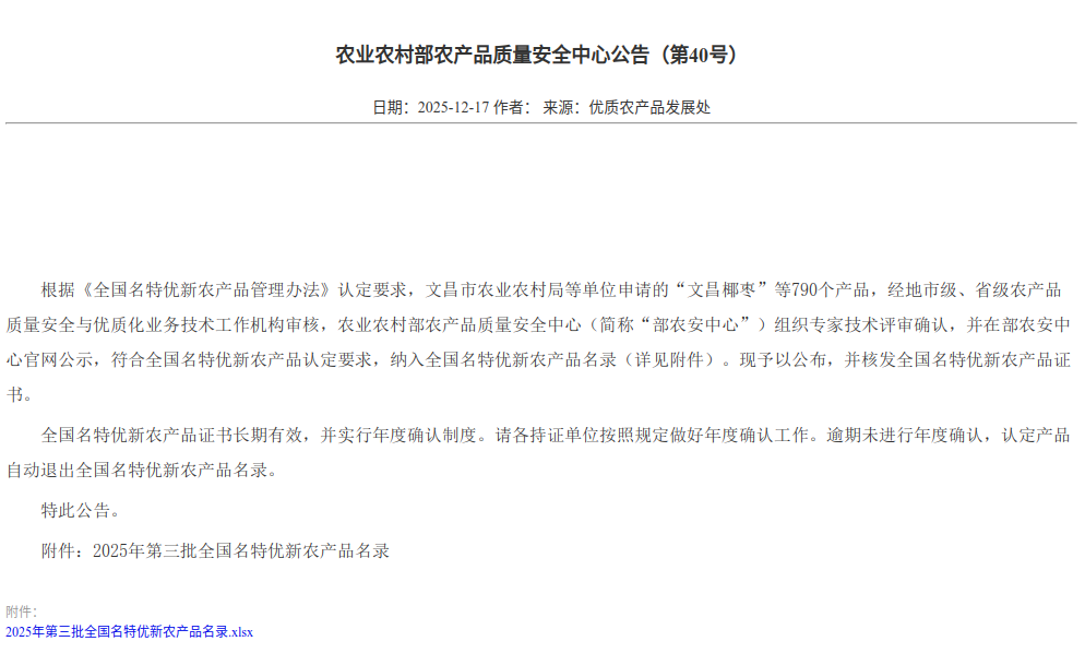 全国名特优新农产品,是指在特定区域(原则上以县域为单元)内生产、具备一定生产规模和商品量、具有显著地域特征和独特营养品质特色、有稳定的供应量和消费市场、公众认知度和美誉度高并经农业农村部农产品质量安全中心登录公告和核发证书的农产品(包括种植业和养殖业产品及其产地初加工产品)。这些产品不仅满足了消费者对高品质农产品的需求,也促进了当地农业的可持续发展。