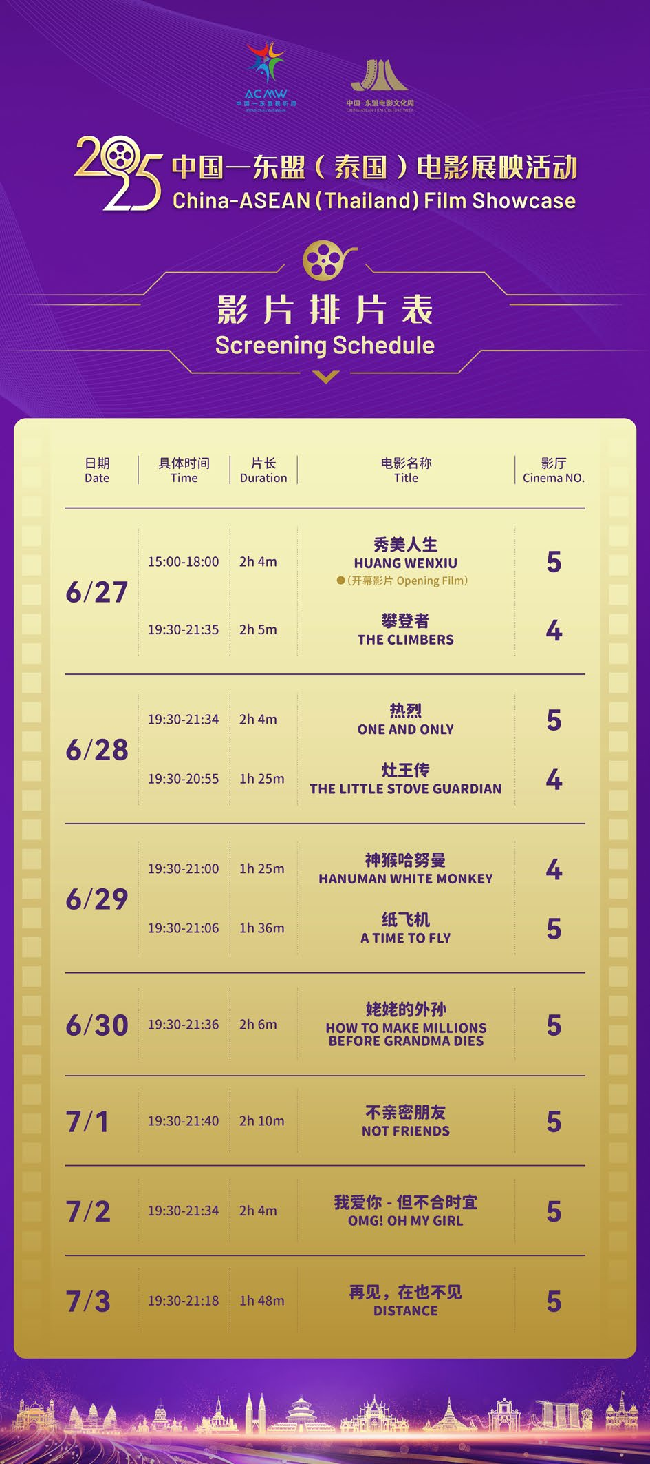 2025年是中国—东盟人文交流年,也是中泰建交50周年暨“中泰友谊金色50年”,6月26日,第七届中国—东盟视听周在泰国曼谷开幕,作为第七届中国—东盟视听周系列活动之一,2025中国—东盟(泰国)电影文化周同期举办。电影文化周活动以“山水同映·光影同梦”为主题,由中国电影家协会、泰国媒体发展基金会、中国广西壮族自治区电影局、泰国旅游与体育部旅游厅、中国广西壮族自治区外事办公室、中国广西壮族自治区文学艺术界联合会、中国广西文化产业集团有限公司等中泰单位共同主办,开展以“中国—泰国电影共创合作探索”为主题的电影合作对话会、电影展映启幕式和电影展映等三大活动。