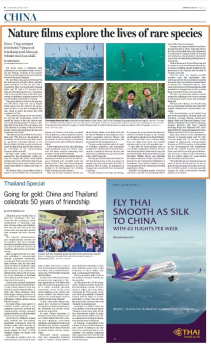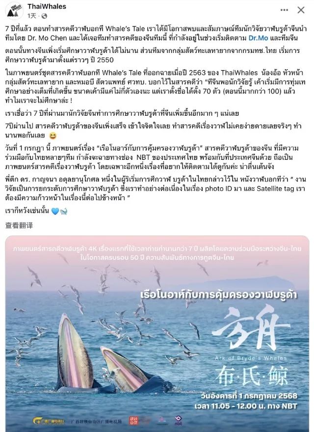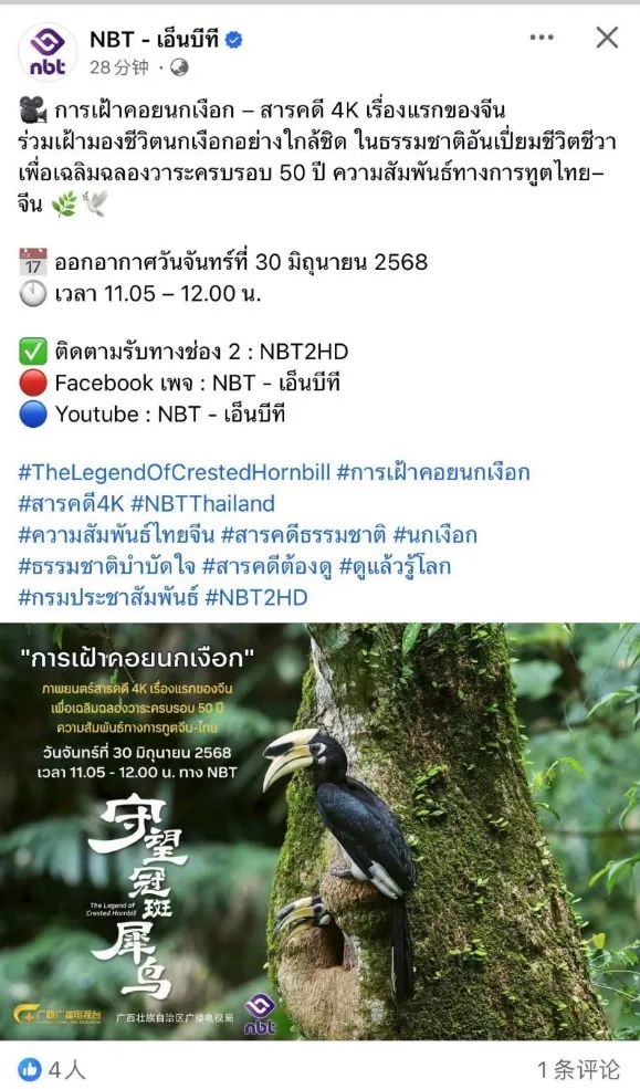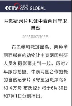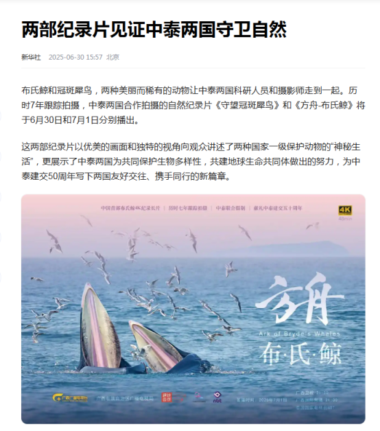 在中泰建交50周年之际,6月30日至7月1日,中国—东盟合拍计划扶持的中泰合拍自然纪录片《方舟—布氏鲸》和《守望冠斑犀鸟》,先后在中泰两国同步播映,为中泰建交50周年写下友好交往、携手同行的新时代篇章。