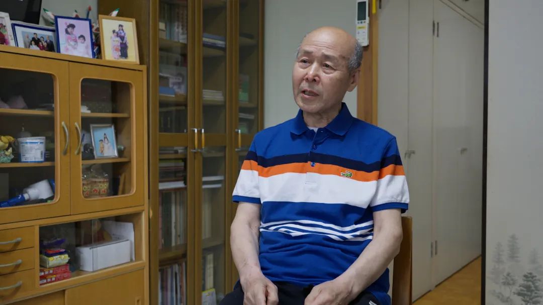 (87岁的日本遗孤庄山纮宇在家中接受摄制组采访)