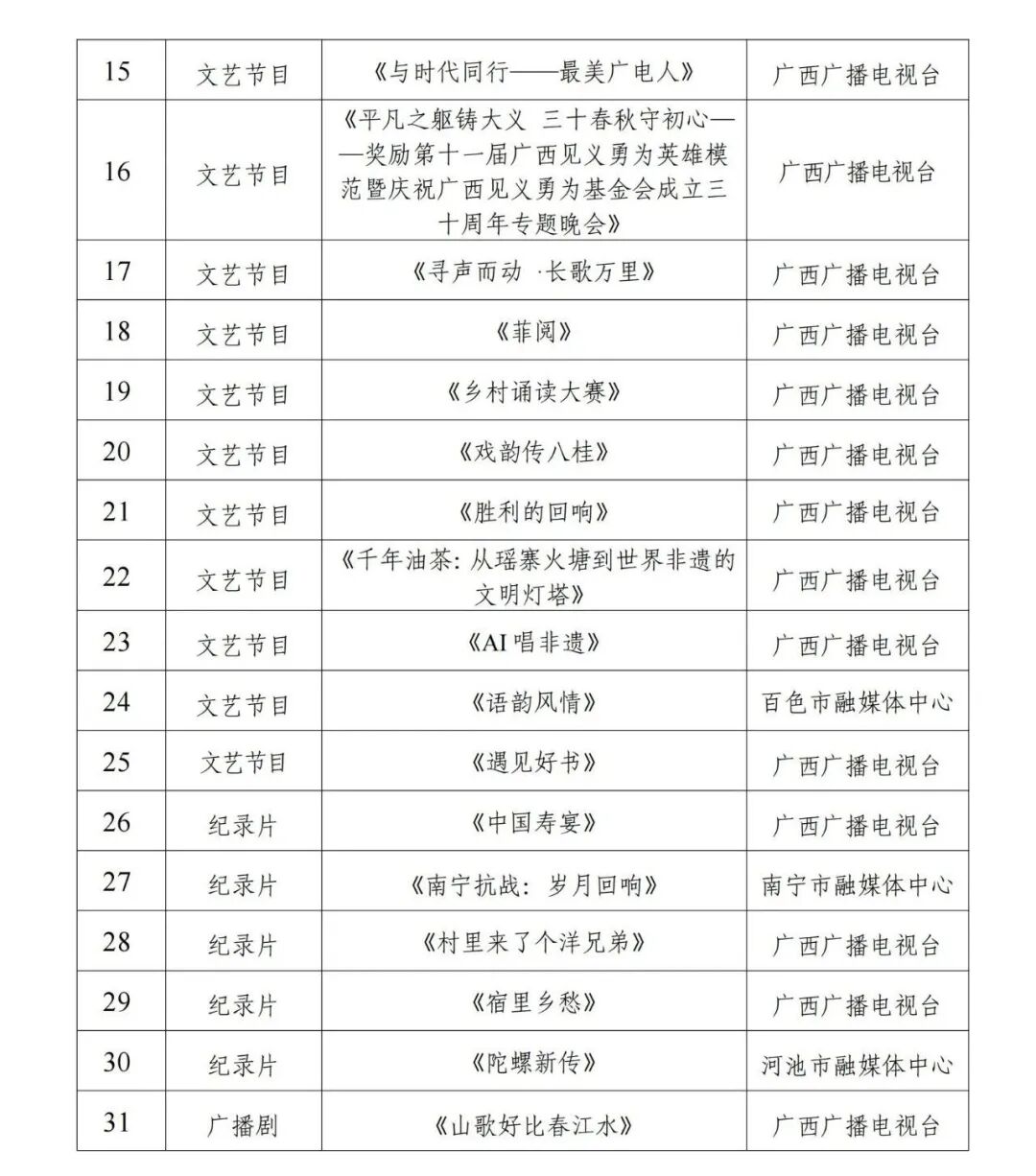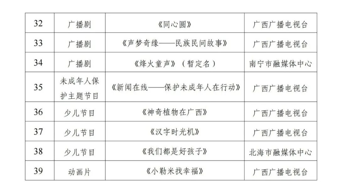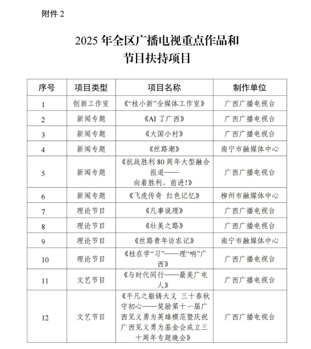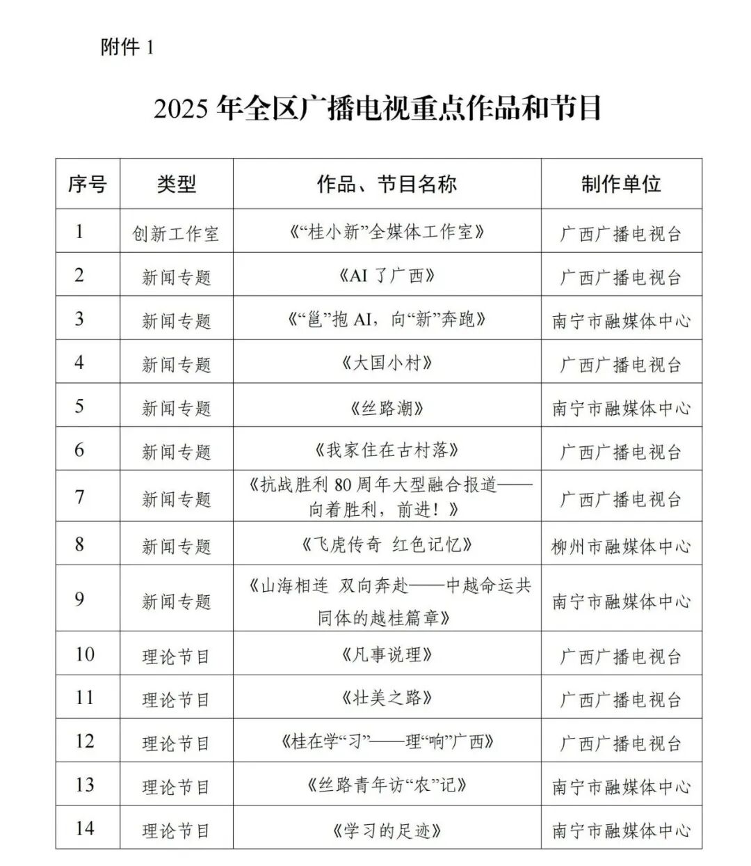 为贯彻落实《全区广播电视和网络视听精品生产三年行动方案(2023-2025年)》精神,讲好广西故事,传播广西声音,壮大主流思想舆论,推动全区广播电视精品生产持续繁荣、实现高质量发展。近期,自治区广电局组织行业专家对全区各级广播电视制作播出机构的广播电视重点作品和节目进行论证评选,共评选出《“桂小新”全媒体工作室》《AI了广西》等39个2025年全区广播电视重点作品和节目。