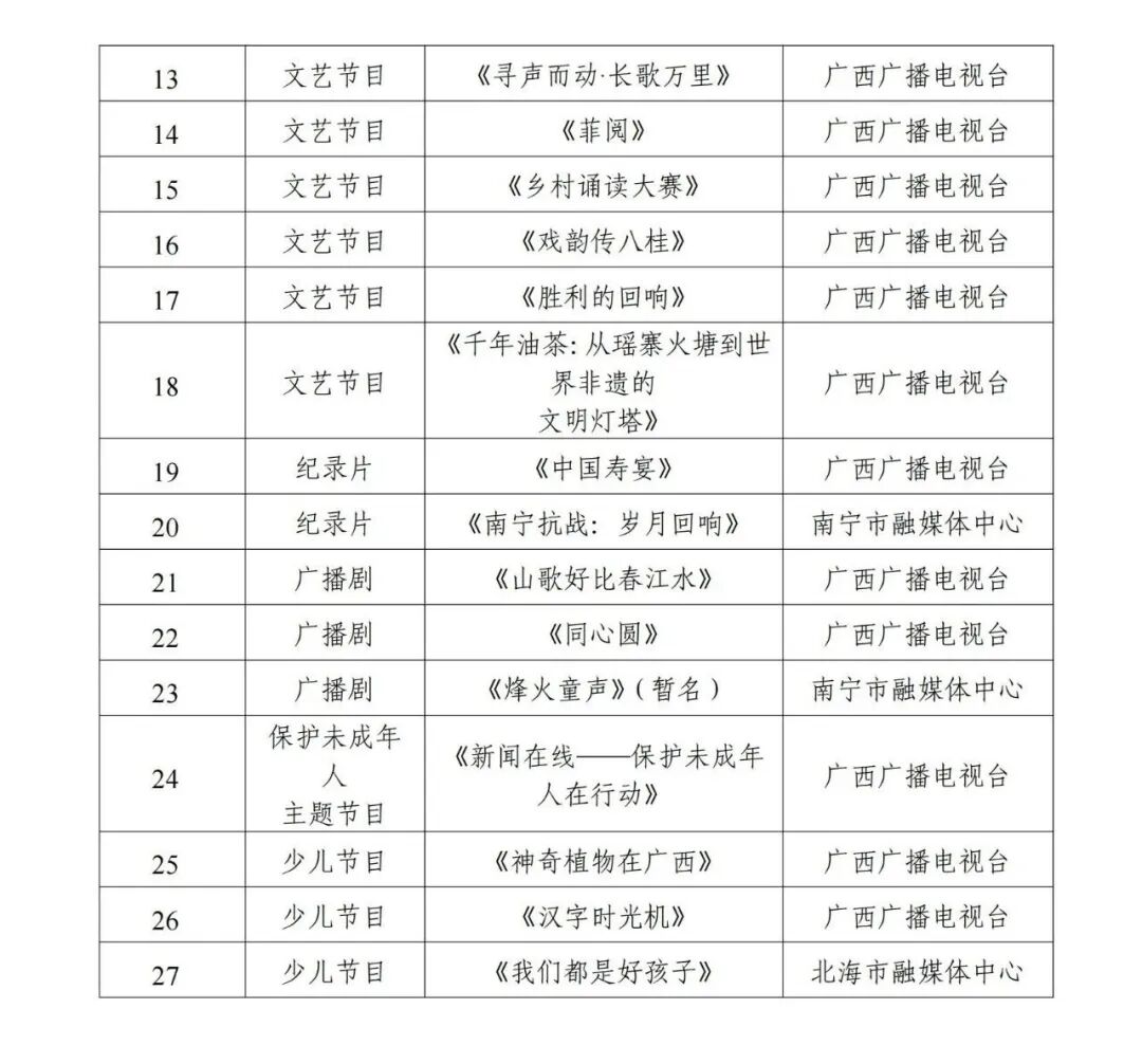 按照“找准选题、讲好故事、拍出精品”要求,依据评选结果排序,重点围绕主题主线宣传、创作团队实力、资金落实等多方面综合考量,拟择优扶持27个2025年全区广播电视重点作品和节目。现予以公示。