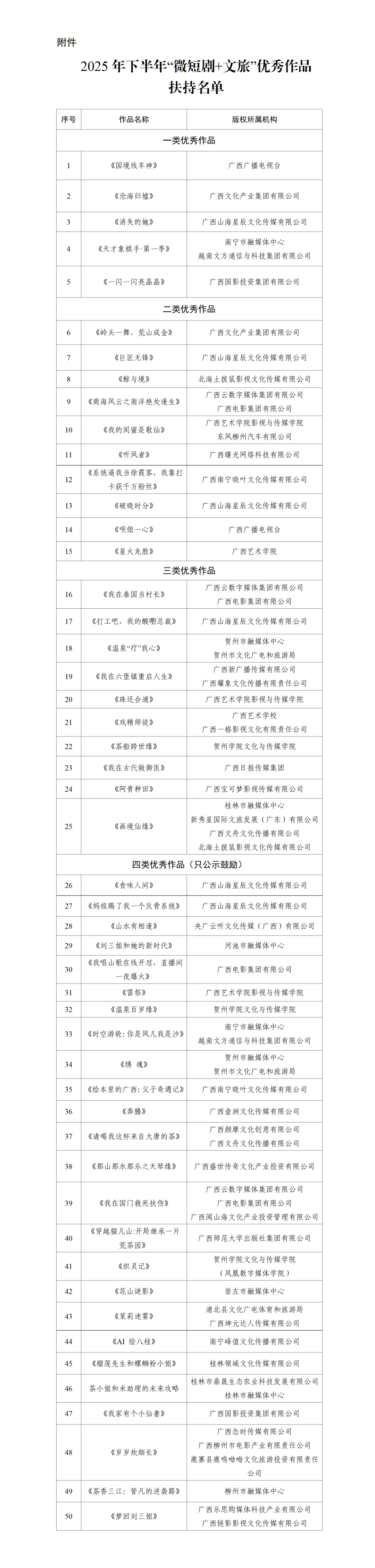 为推动广西微短剧精品创作,服务广西旅游年建设,根据《自治区广电局关于印发〈2025年“微短剧+文旅”融合发展专项行动方案〉的通知》《自治区广电局关于征集2025年下半年“微短剧+文旅”优秀作品项目的通知》,我局面向全区开展“微短剧+文旅”优秀作品征集活动。经专家评审、公示,共评出2025年下半年“微短剧+文旅”优秀作品50部,现将评选结果予以公布(见附件)。