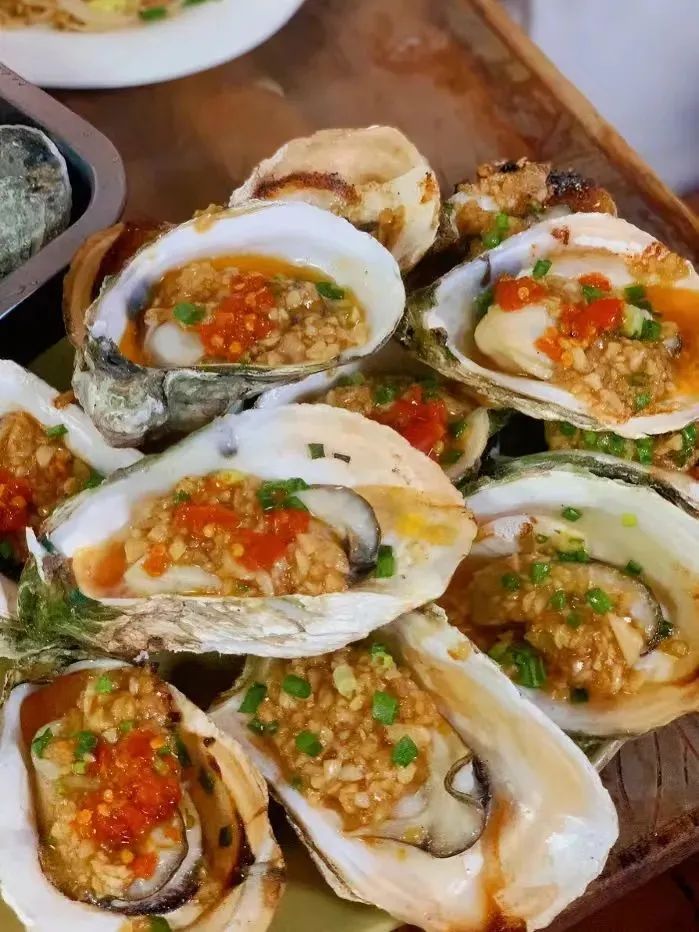 生蚝最经典的吃法当然就是炭烤了。将大蚝洗净,用刀撬开,铺展在烧烤网上,再逐个加入配制好的蒜蓉辣酱,最后任由炭火炙烤,蒜香扑鼻~