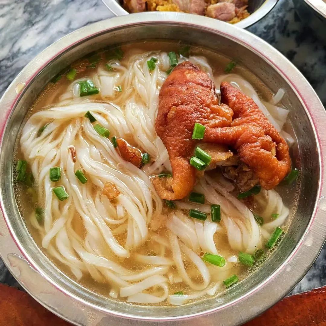 烫好的粉浇上一勺猪脚卤汁,注入灵魂,汤色微黄,猪脚软而不烂、肥而不腻、Q弹香脆,满满的胶原蛋白,连汤带粉一碗下肚,浑身舒畅。