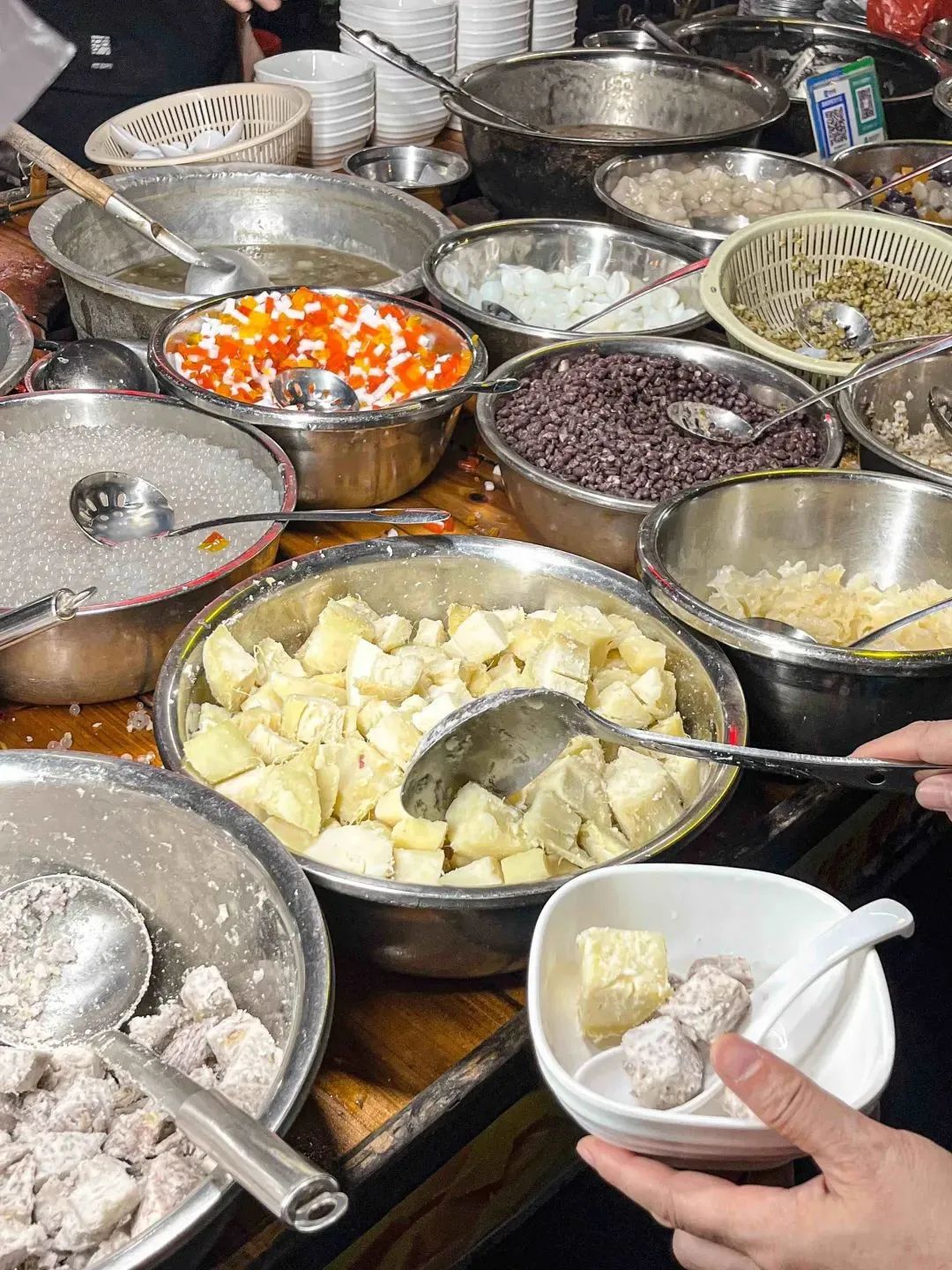 摊位上十几种小料任你挑选,不限种类,不限数量。常见芋头、凉粉、西米露、红豆是必选小料,想尝鲜的朋友也可以试试钦州的槐花粉,虽形状似虫,但甘甜滑嫩。挑好小料,再让店家浇上清甜的椰奶或糖水,一碗下肚,不撑不少,解渴解馋,食得甜蜜。