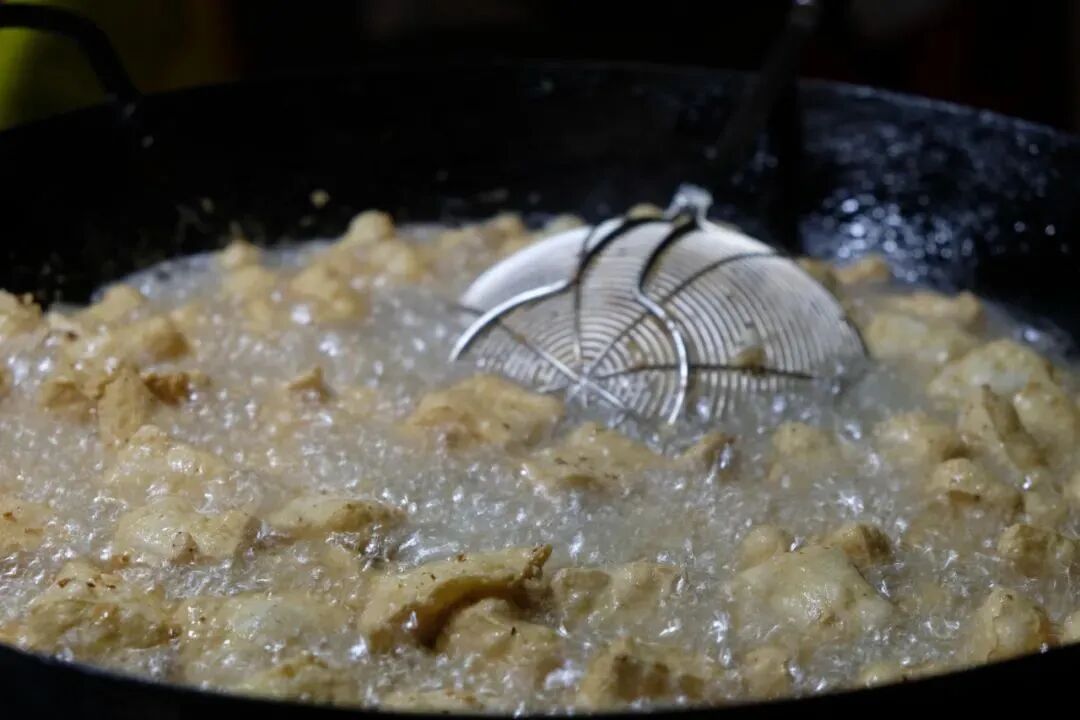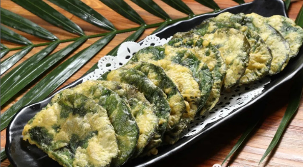 假蒌饼是广西特色小吃,是用假篓(一种重要的调味品)包着肉馅裹淀粉炸制而成。被炸至酥脆的叶子,带着植物纯粹特有的天然草木香和肉馅的鲜美。