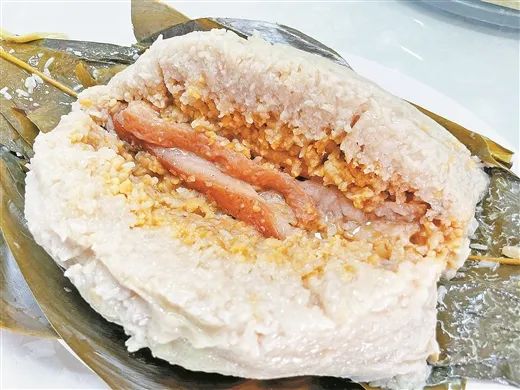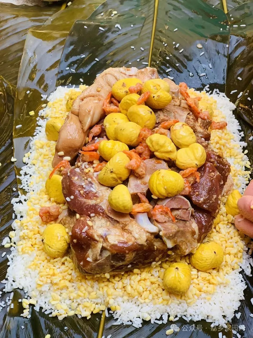 灵山大粽使用的材料都是采自灵山本地,特别是用本土猪肉,肥瘦均匀、质地松软,肉味可以渗透到糯米中,使粽子吃起来香滑可口。不仅如此,灵山大粽还可包入猪蹄、香鸡、特色腊味等食材,味道鲜美,打开粽叶,粽香撩人味蕾。