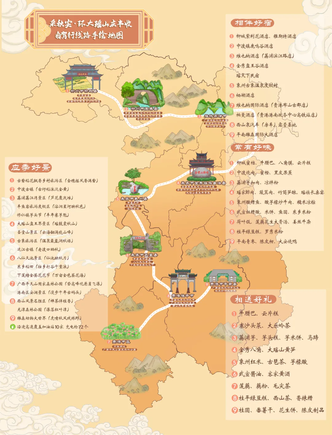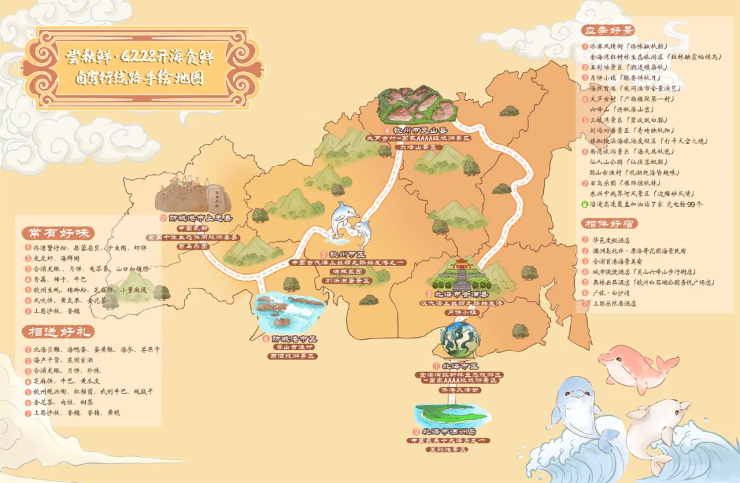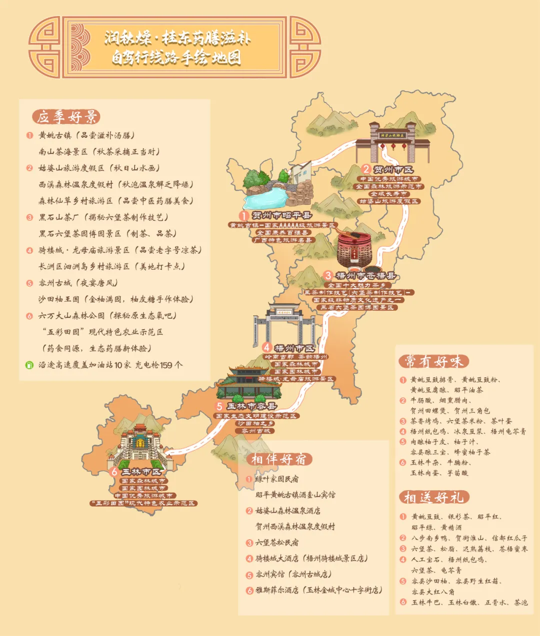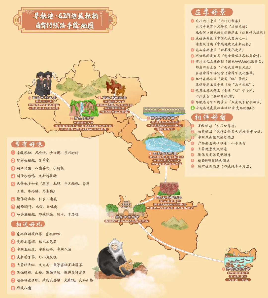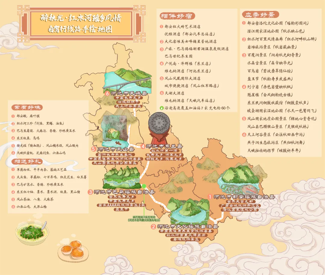 桂林市区→桂林市龙胜各族自治县→柳州市三江侗族自治县→柳州市融水苗族自治县→河池市罗城仫佬族自治县→河池市区→河池市环江毛南族自治县→河池市南丹县金秋桂北,稻田染金,晒秋正浓!自驾穿行桂北山水,邂逅龙脊梯田“大地调色板”的震撼,体验侗寨“百家宴晒秋”的热闹;在苗寨参与“金秋烧鱼节”,感受稻田抓鱼的趣味;探访仫佬族古村,看玉米、辣椒在屋檐下铺展成画;南丹巴平梯田的千亩稻浪与天峨红水河的秋日碧波相映,一路赏秋景、品秋味、拾秋趣,沉浸式感受桂北民族秋收的烟火与诗意!北海市区→北海市涠洲岛→北海市合浦县→钦州市灵山县→钦州市区→防城港市区→防城港市上思县漫步侨港风情街,感受越南侨乡的秋日烟火气;登上涠洲岛五彩滩,看潮水退去后礁石披上斑斓秋装。合浦月饼小镇飘来阵阵酥香,与中秋明月共酿乡愁。灵山大芦古村的古宅旁,金柿压枝,写满岁月静好;六峰山层林尽染,丹枫为石峰添一抹浓烈。钦州三娘湾的白海豚跃出碧波,与秋阳共舞;刘冯旧居的青砖黛瓦在落叶中更显沧桑;那雾山红叶漫野,雾里看秋别具诗意。防城港西湾的晚霞将海天染成金红,仙人山的枫径引你登高望海;百鸟乐园候鸟翩跹,掠过秋林如画。这个秋天,来北部湾赏山海秋韵,品舌尖风味,让每一帧风景都成为难忘回忆!桂林市兴安县→桂林市灵川县→桂林市区→桂林市恭城瑶族自治县→桂林市阳朔县秋日桂北,一路秋景如画。从桂林市兴安县启程,“华南之巅”猫儿山层林尽染,秋色浓烈,灵渠两岸栾树花红,桂花飘香;灵川县中,古东瀑布景区红叶满山、瀑布奇绝,大圩古镇沉淀着千年烟火,海洋乡的万亩银杏金黄绚烂,宛如金色海洋,东漓古村的美好田园诗画待你探寻;走进桂林市区,白天在桂花公社沉浸式体验桂花文化,夜幕降临前到漓江打卡最美落日;秋季必去恭城红岩村的月柿节,将“柿柿如意”装在兜里,更有“岭南第一庙”——恭城文庙待你探索;终至阳朔,兴坪古镇秋韵悠长,西街秋夜美食欢腾,还能走进现实版“桃花源”。线路全程尽揽桂北秋季的绚烂与热烈,每一步都是秋的诗意。河池市都安瑶族自治县→河池市大化瑶族自治县→河池市巴马瑶族自治县→河池市东兰县→河池市凤山县→河池市天峨县秋临河池,瑶乡画卷徐徐展开:都安密洛陀文化公园内瑶服翩跹,澄江湿地秋水如镜倒映丹霞;红水河畔大化百里画廊秋山醉人,岩滩怪石嶙峋藏幽景;巴马百魔洞光影幻化,水晶宫晶帘流光,长寿节众人共庆寿乡秋韵;东兰列宁岩赤色枫叶映照革命烽火,魁星楼铜韵绕梁,铜鼓山歌节千鼓震野;凤山地质公园探地心奇观,巴腊猴山灵猴嬉闹秋林;天峨河谷云雾缭绕,燕子洞燕群归巢,壮族蚂拐节蛙鼓祈丰收。这一路,赏奇峰、探秘境、听铜鼓、品寿宴,秋色与风情交织,共赴一场多彩瑶乡的秋日之约!防城港东兴市→崇左凭祥市→崇左市宁明县→崇左市大新县→崇左市天等县→百色市德保县→百色靖西市→百色市那坡县东兴启程,在国门景区挑选异国好物;中越界河漾起秋日微波,北仑河口的红林间,候鸟正衔来迁徙的诗意;崇左凭祥,友谊关的雄姿映着秋阳,浦寨风情街这一中越边境文旅新地标等你打卡;宁明,花山岩画诉说着骆越史诗;大新,明仕田园稻香与咖啡香交织成诗;天等,漫步丽川文化森林公园的森林氧吧,都康田园赏霞光秋色,壮族霜降节博物馆藏着秋日民俗的温暖记忆。百色的秋景也在招手:德保红叶森林公园万亩枫林让人沉醉,还能到矮马王国骑上可爱的德保矮马;跑进靖西鹅泉的金黄“稻”梦空间,到旧州景区亲手做一个精美的壮锦绣球;在那坡尼的呀田园景区拍一组田园风光大片,感受黑衣壮文化的独特魅力。线路融合边关历史、喀斯特地貌与秋季农耕景观,呈现“一步一秋景,一县一边情”的自驾体验。贺州市昭平县→贺州市区→梧州市苍梧县→梧州市区→玉林市容县→玉林市区邀您金秋探访桂东三城(贺州、梧州、玉林)。沿途品黄姚滋补汤膳、森林仙草药膳、梧州老字号凉茶,以地道食养调和秋燥。当季体验采秋茶、黑石六堡品茶韵,在沙田柚王国品尝金柚清甜。暖泉祛燥,姑婆山秋色层林尽染。动静结合养身心,药膳进补、温泉滋润、尽享秋实,驱秋燥正当时!南宁市区→南宁市武鸣区→南宁市马山县→南宁市上林县→南宁市宾阳县来南宁共赴金秋盛宴!登青秀山赏花观鸟、顶蛳山百亩稻浪飘香;武鸣区伊岭岩壮乡风情浓郁、登大明山必打卡云海日出;马山县品味黑山羊美食盛宴;上林县茶园采秋茶制香茗,体验秋日别样精彩;宾阳县欣赏古辣巨型稻田画。环大明山驰骋秋色长廊,全程相伴好宿,让你旅途舒适休憩;舌尖邂逅老友粉、柠檬鸭、黑山羊宴等特色美食,让你品尝地道风味;壮锦、老友粉、上林大米等特色伴手礼,让你将这份秋日的美好带回家。柳州市柳城县→柳州市鹿寨县→桂林荔浦市→来宾市金秀瑶族自治县→来宾市象州县→来宾市武宣县→贵港市区→贵港桂平市→贵港市平南县秋入八桂,山河绘就斑斓长卷:在柳城古砦稻浪翻金的壮乡梯田间,感受丰收脉搏;鹿寨中渡古镇的老街晒秋场景,将时光染作暖黄。荔浦的秋色在丰鱼岩溶洞星河中流淌,荔江湾芦花覆岸如雪纷飞,更有修仁芋魁争霸的农趣盛会。深入大瑶山,金秀盘王界的瑶鼓震彻层林,圣堂山云涛奔涌似仙境垂帘;象州古象温泉氤氲润秋,运江渡口的晒秋画卷铺满