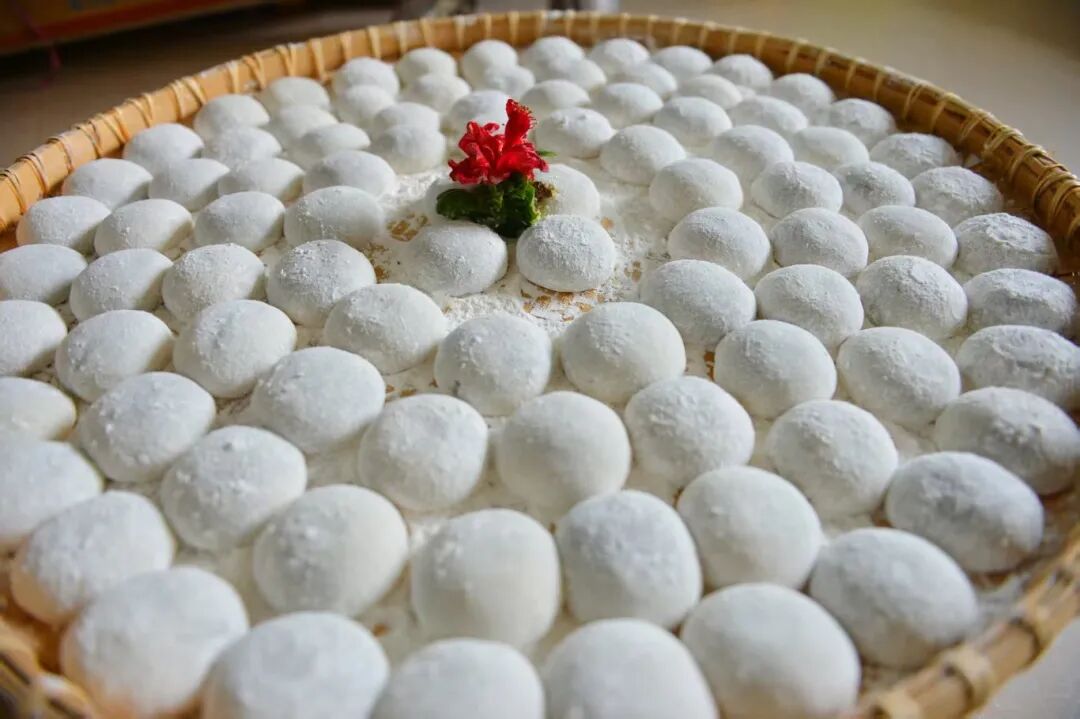 糍籺外形为椭圆或圆形,寓意“圆圆满满”的意思。当地人在制作白糍籺作为孩子满月酒的回礼时,为了图个吉利,故意捏出一个小“尾巴”,寓意多子多福,财源滚滚。刚做出来的白糍籺绵软柔韧,扁圆温暖,米香四溢,入口即化。2021年2月,“泉水白糍籺制作技艺”列入第六批市级非遗代表性项目名录。