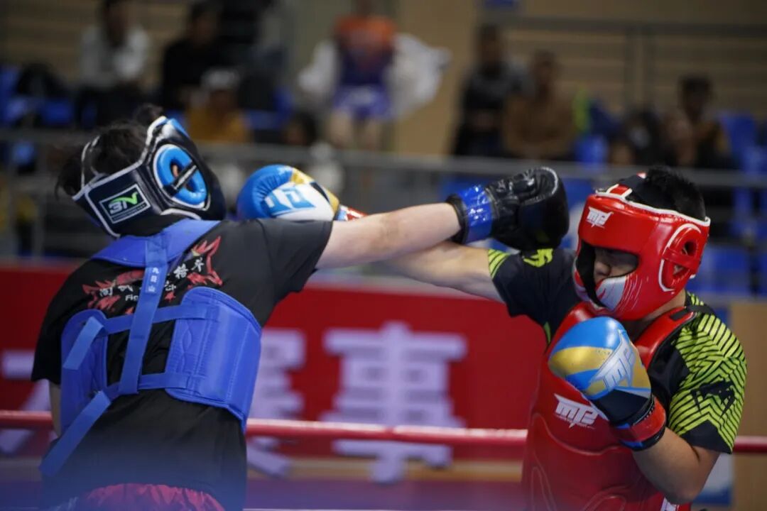 赛场上,武术健儿个个精神抖擞,为了荣誉全力拼搏。在散打项目中,选手们眼神犀利如鹰,紧紧盯着对手的一举一动。比赛开始,一方选手迅速发起进攻,低鞭腿如疾风扫过,另一方选手侧身敏捷躲过,随即一记直拳迅猛回击,拳风呼啸。两人你来我往,拳脚相加,汗水湿透了衣衫,却没有一人有丝毫退缩之意。