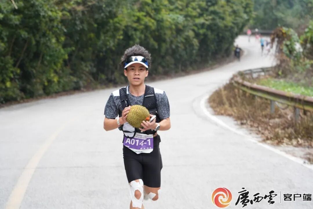 南宁简约跑团的40余位团员格外抢眼——不少人怀里抱着沉甸甸的榴莲,边跑边笑。团员刘少欣和同伴并肩征战团体混合组,一路抱着榴莲闯过陡坡、跨过溪流,脸上沾着汗珠却笑容灿烂:“这次赛事也太会玩了!主办方居然准备了榴莲,我们边跑边分享,嘴里是香甜果肉,眼里是青山绿水,这体验感简直绝了!”