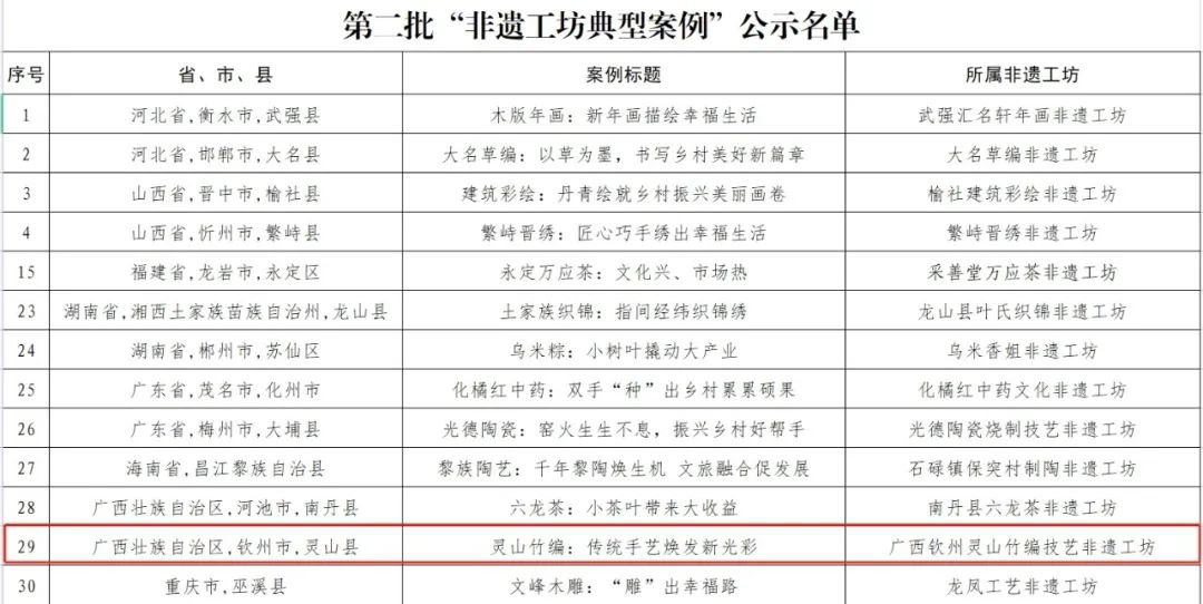 3月17日,文化和旅游部非物质文化遗产司发布关于第二批“非遗工坊典型案例”推荐名单的公示,灵山县送选的广西钦州灵山竹编技艺非遗工坊案例“灵山竹编:传统手艺焕发新光彩”入选,这也是钦州市唯一入选案例。