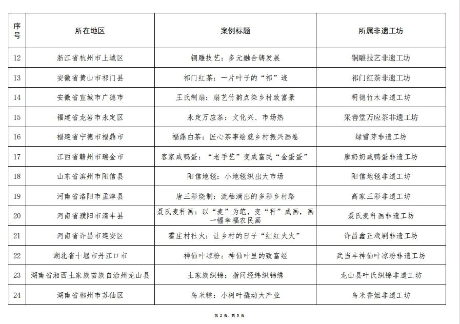 根据《文化和旅游部办公厅 人力资源社会保障部办公厅 农业农村部办公厅关于推荐第二批“非遗工坊典型案例”的通知》安排,文化和旅游部、人力资源社会保障部、农业农村部组织开展了第二批“非遗工坊典型案例”(以下简称“典型案例”)推荐工作,在各地积极申报的基础上,经研究遴选并经公示,确定了51个典型案例,现将名单予以公布(见附件)。