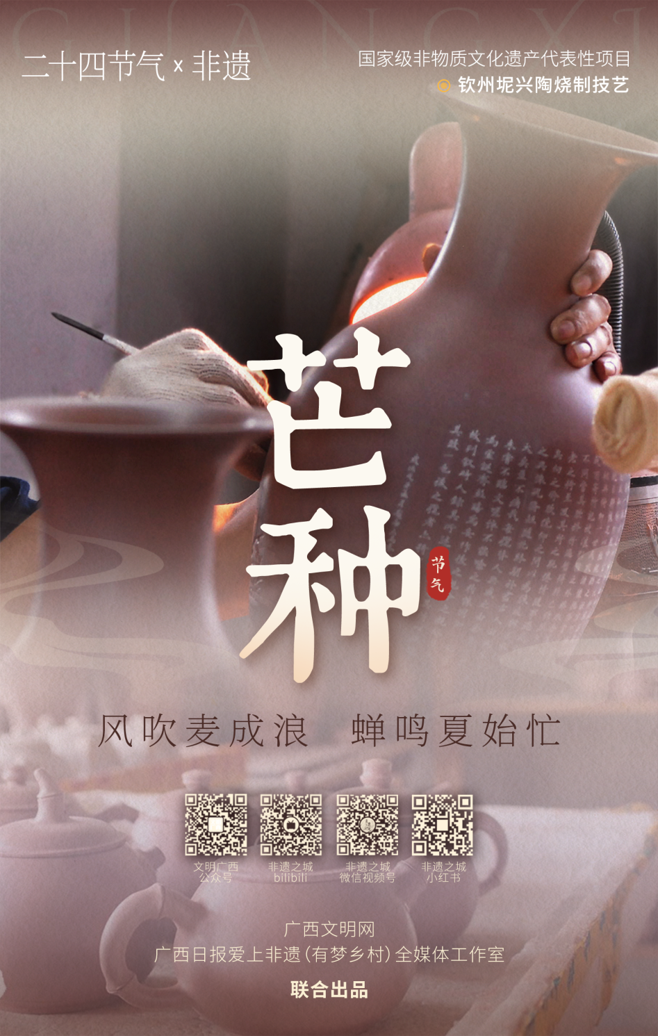 仲夏时节,风吹麦浪。民间有俗语“芒种芒种,忙收忙种”,芒种时节也是插秧种稻的日子,无论南北,都是农家最为忙碌的时辰。农人们辛勤劳作之时,钦州制陶的手艺人们也守着窑火,等待泥土在炽热中绽放独一无二的光华。