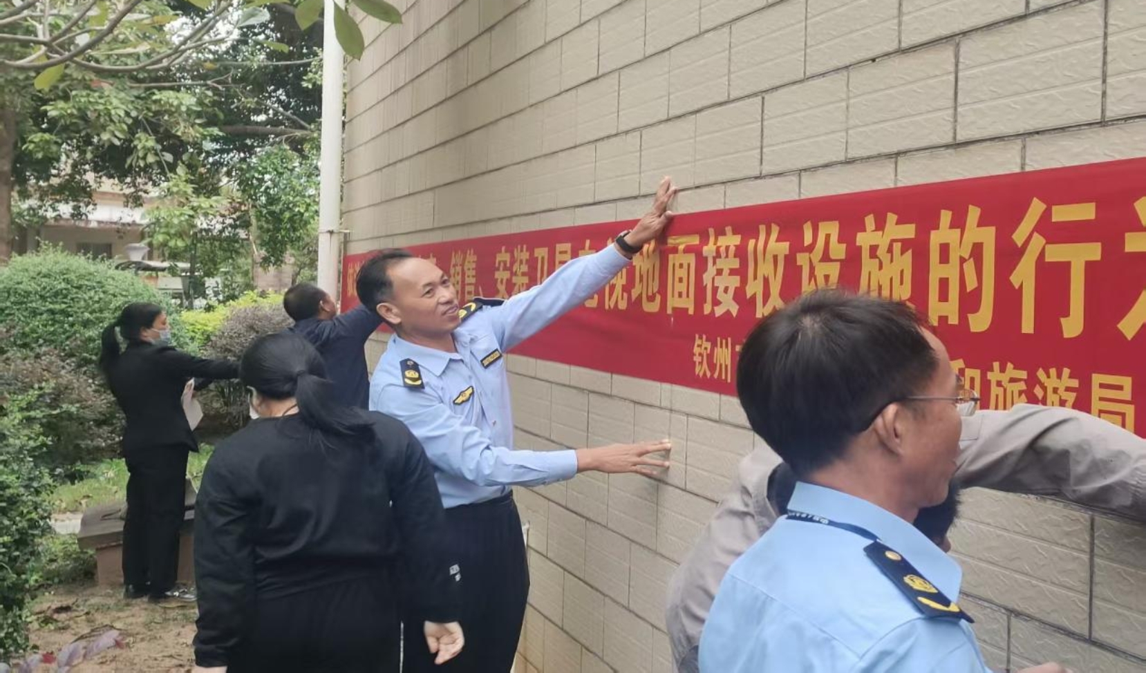 △执法人员联合钦北区文化广电体育和旅游局悬挂宣传横幅