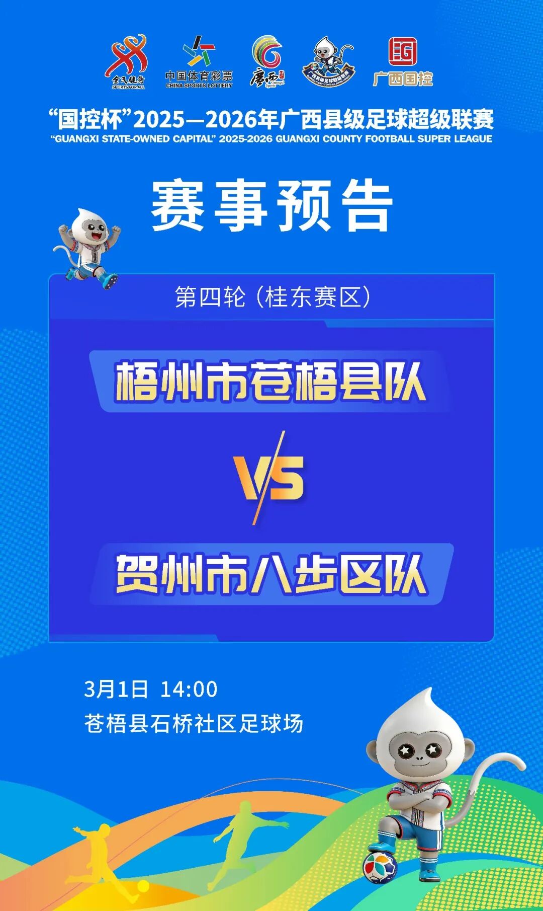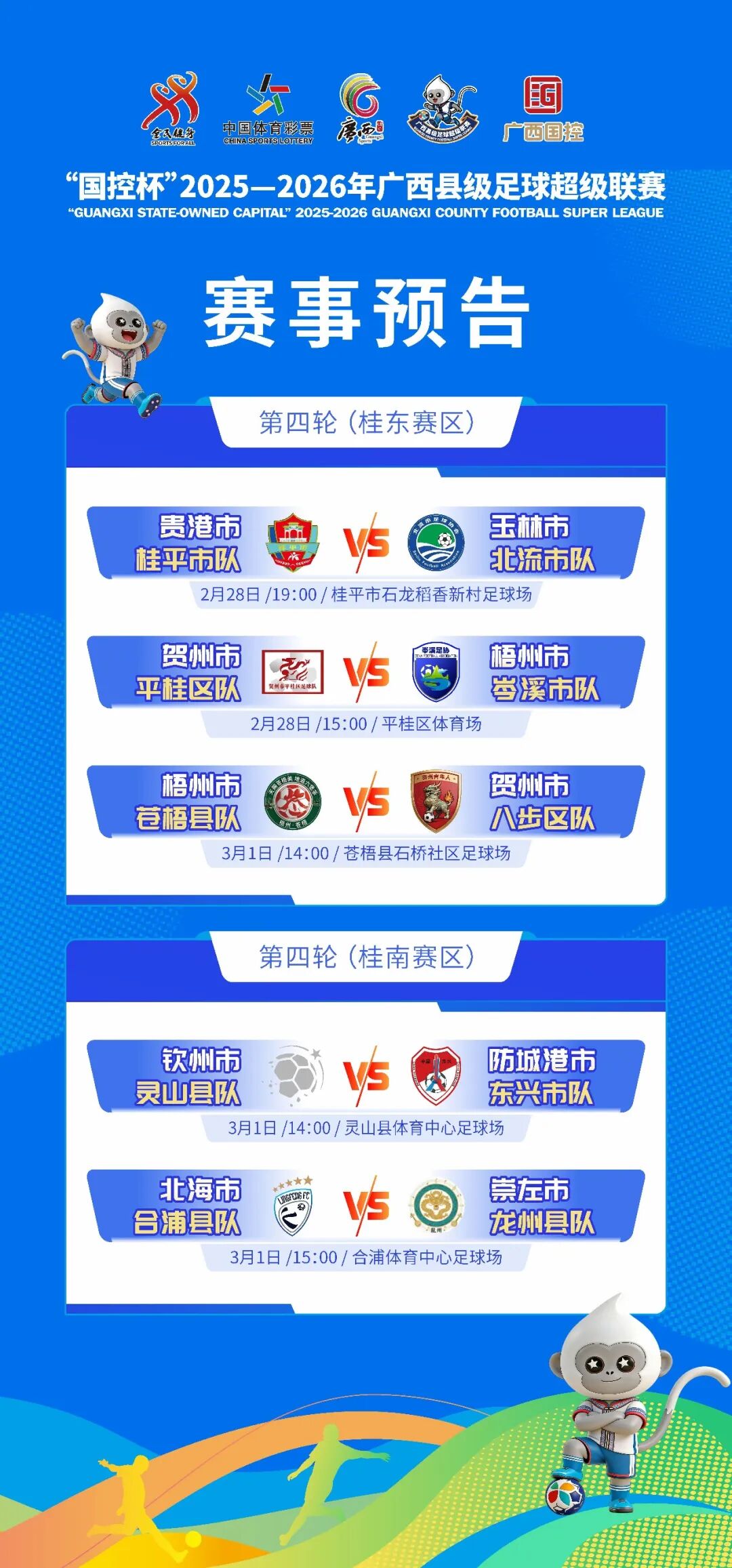 本轮赛事均在周末举行,其中,2月28日的两场比赛恰逢工作日,请广大球迷合理规划观赛时间。遵守赛场秩序,文明观赛,共同为家乡球队呐喊助威,感受广西县超独有的绿茵激情。