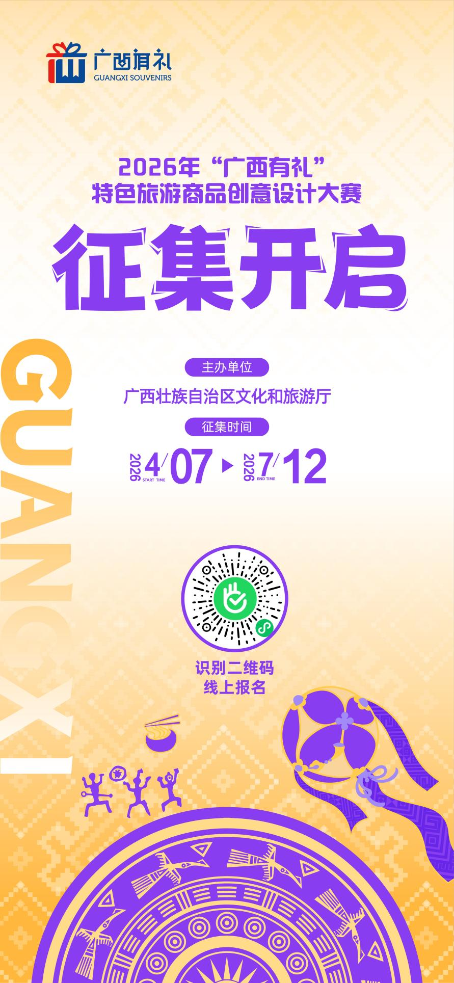 桂风融创意,好物礼八桂!由广西壮族自治区文化和旅游厅主办的2026年“广西有礼”特色旅游商品创意设计大赛,即日起开启作品征集!本次大赛以 “广西有礼 礼遇八桂”为主题,面向全区各界创意力量开展,旨在深挖八桂文化底蕴,打造兼具地域特色、创意价值与市场潜力的旅游商品,让广西好物走出八桂、走向全国!城市礼物板块:打造礼盒装城市伴手礼,把一座城的故事藏进一份礼物中;对外文化交流礼品板块:以壮锦、坭兴陶等元素打造 “有广西味、具世界范” 的文创;八桂创意文旅融合板块:涵盖文物衍生、非遗新生等方向,推动传统与现代融合;八桂风味食品板块:征集广西特色伴手礼食品,打造地道桂味标杆。企业组:广西区内企事业单位、研发机构、文创试点单位均可报名;高校组:广西区内大中专院校师生均可参与,轻松解锁创意变现机会!重磅奖项:企业组、高校组均设金银铜奖及优秀奖,另设专项奖、人气奖等,奖杯证书一应俱全。国家级平台推荐:优秀作品将获得参与遴选的机会,若遴选通过,则代表广西参加国家级赛事。 全渠道曝光:线下进驻景区、商超、机场等核心渠道,亮相中国—东盟博览会;线上入驻 “一键游广西” 平台,获得新媒体矩阵推广。即日起至7月12日18:00,可通过“广西文化和旅游厅”官网、“一键游广西” 小程序、“广西旅游商品行业协会”等渠道查看完整通知、报名入口及细则,也可咨询大赛组委会了解详情。以创意为笔,为文化赋能;以好物为媒,讲好广西故事。诚邀深耕行业的团队,共赴这场创意盛宴!