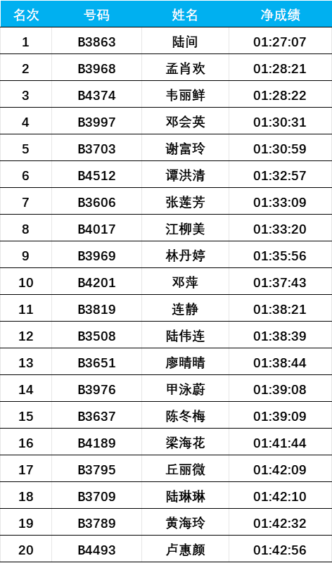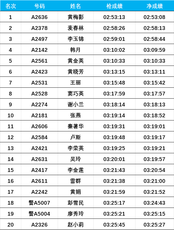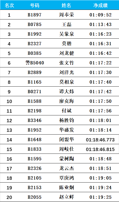 1.马拉松项目名次奖的男女前三名按照枪声成绩进行排名,四至二十名按照净计时成绩录取;半程马拉松项目的男女前二十名按照净计时成绩录取。