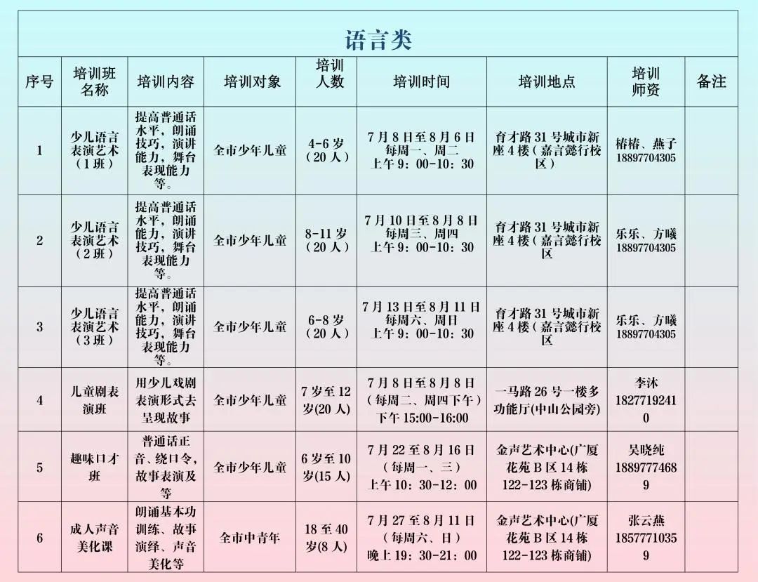 本次培训开设音乐 舞蹈 器乐 语言类、美术 书法 摄影类、积木 机器人编程 围棋类、其它类4大类别,共58个班级,成人班和少儿班都有开设!名额有限,快来报名吧!