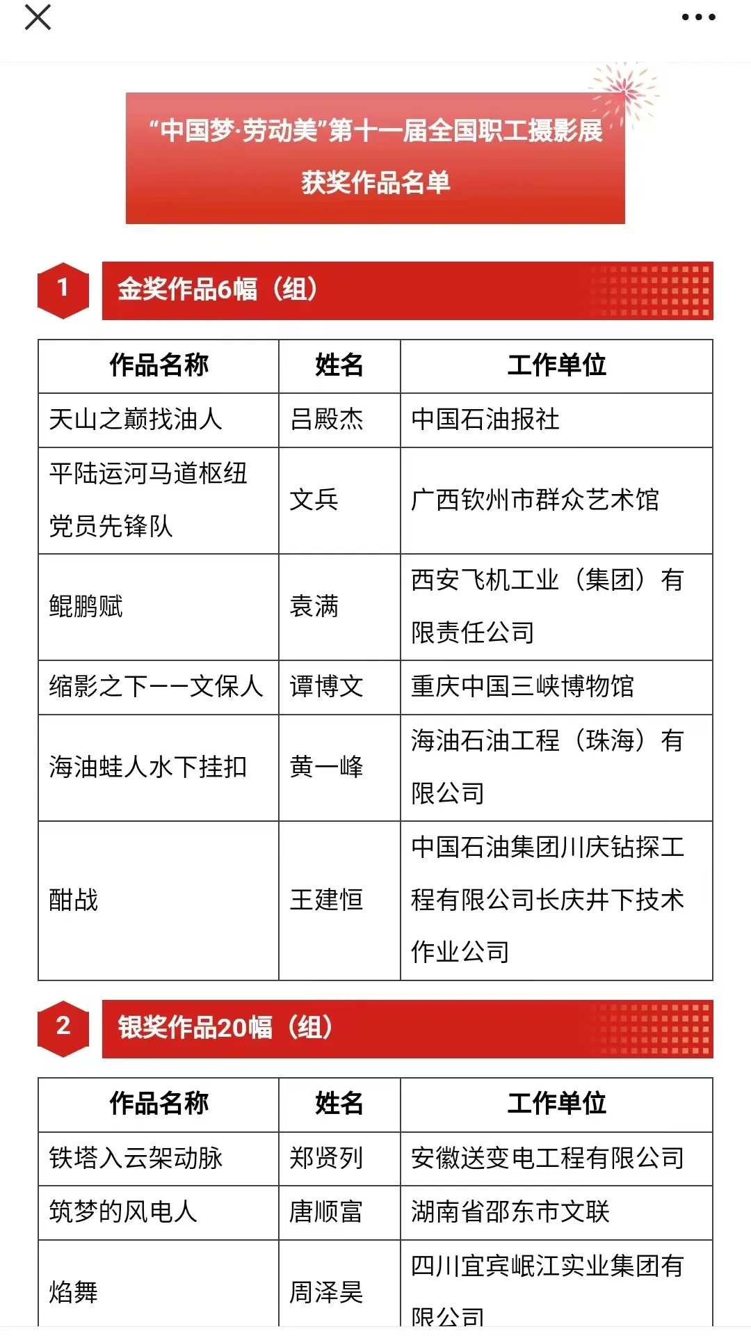 全国职工摄影展自今年5月启动,共征集到1万余名职工的作品27000余张。经初筛、初评、终评、公示,最终评选出金奖作品6幅(组)、银奖20幅(组)、铜奖30幅(组)、优秀作品奖287幅(组),均为各行各业职工拍摄。