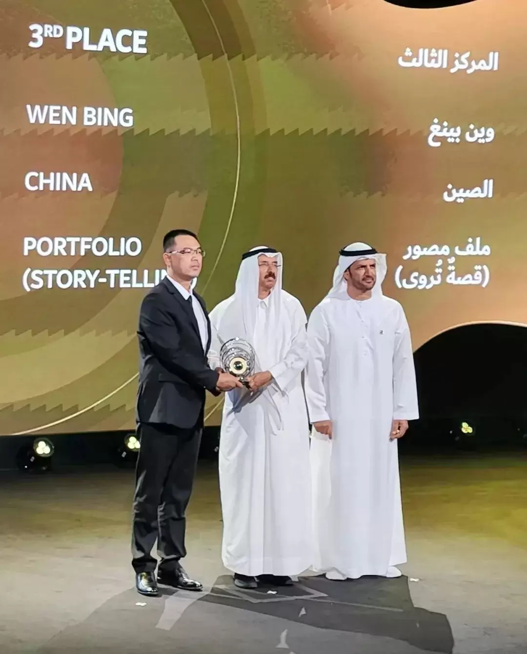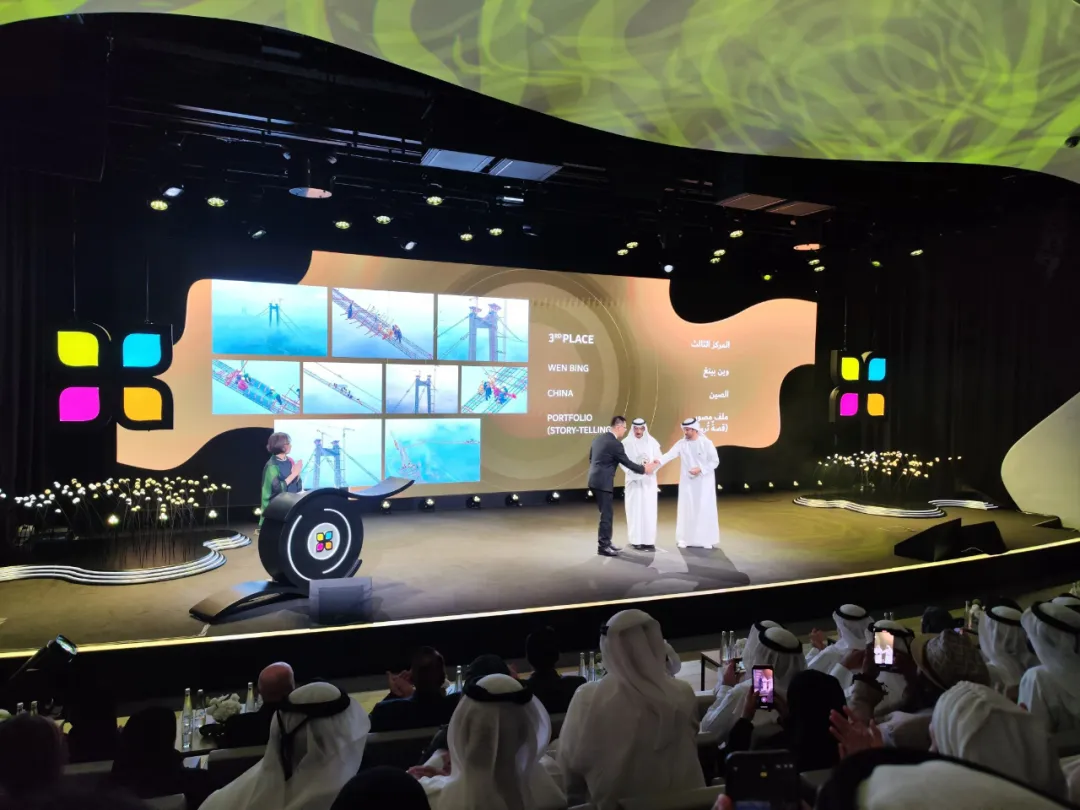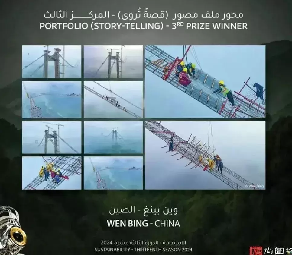 第十三届阿联酋迪拜哈姆丹国际摄影大赛揭于当地时间2024年11月12日晚七点揭晓,中国摄影师文兵的作品《云端战士》获得系列组第三名大奖,并获奖金3万美元,折合人民币金近22万元。中国摄影师文兵系钦州市群众艺术馆摄影辅导员,本次获奖的作品为《云端战士》这个系列,作品展示了龙门跨海大桥施工人员在距离海面174米高空中进行猫道架设的场景。远望龙门跨海大桥时,大桥主塔直入云端。现场施工人员头顶白云飞流,脚下洋面翻滚,两边没有防护,生命安全只用几根绳子绑住,但每个人都眼神坚定,毫无畏惧,井然有序的进行着自己手中的工作。
