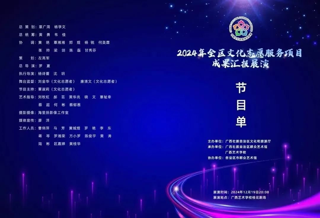 为深入学习贯彻落实党的二十届三中全会精神、学习贯彻领会习近平文化思想、推动全区文化和旅游志愿服务向制度化、规范化、常态化方向发展,提升全区文化和旅游志愿服务的整体效能和质量,12月18日,由广西壮族自治区文化和旅游厅主办、广西群众艺术馆、广西艺术学校承办的2024年全区文化志愿服务队成果展示活动在南宁市隆重举行,我馆组织节目《又一次起航》参与其中。