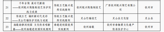 近日,广西壮族自治区文化和旅游厅公布了2024年广西非遗保护优秀实践案例名单,我市钦州坭兴陶烧制技艺、灵山竹编技艺、钦州海歌3个非遗项目的优秀实践案例成功入选。