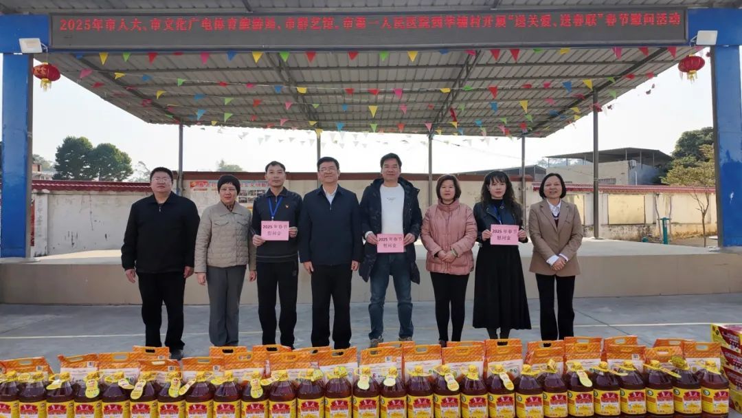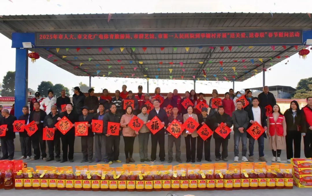 在新春佳节即将来临之际,市人大、市文化广电体育旅游局、市群艺馆、市第一人民医院等单位于1月16日上午齐聚灵山县太平镇华楠村,开展了一场温暖人心的新春慰问及送春联活动,为华楠村的老党员、困难党员、脱贫户、监测户、困难群众、“两委”干部和驻村工作队等共计69人送去新春的祝福和深切的关怀。