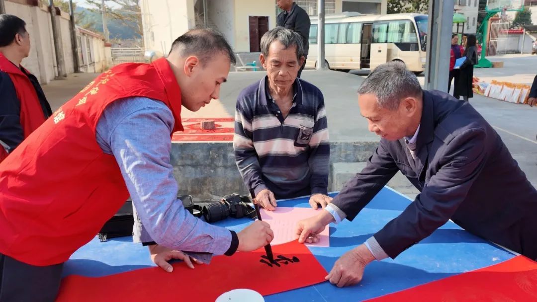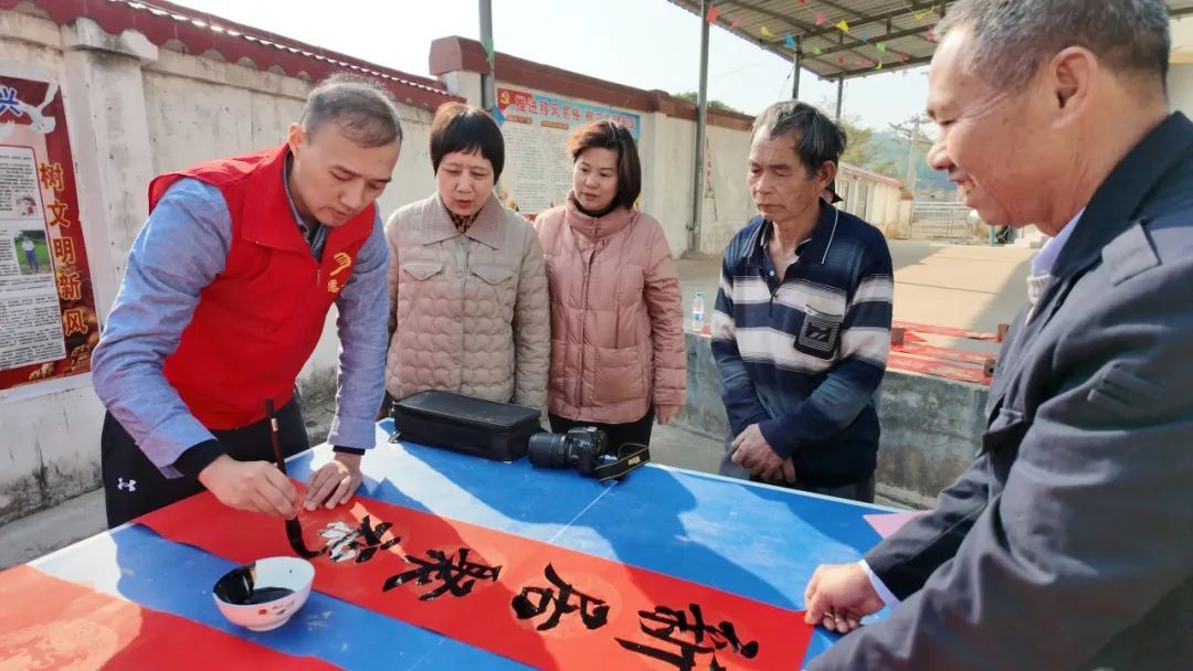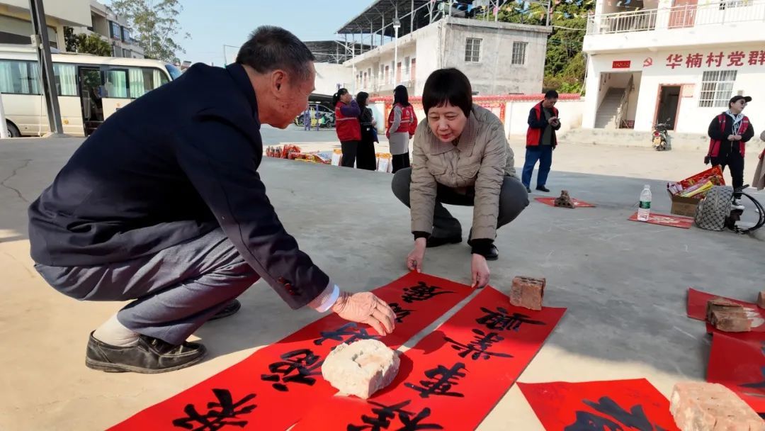 本次活动的一个亮点是义务挥春送福环节。市群艺馆的书法家们在华楠村委广场上为村民义务书写春联,将对新年的美好祝愿融入到一幅幅春联中,整个活动现场充满了浓厚的文化氛围。村民们纷纷围在书法家周围,满含期待地等待作品完成。活动当日,共有100幅春联和60个“福”字被送到村民手中。村民们脸上洋溢着幸福的笑容,对这项充满文化和节日气息的活动给予了高度赞赏。
