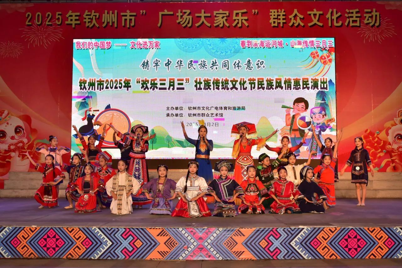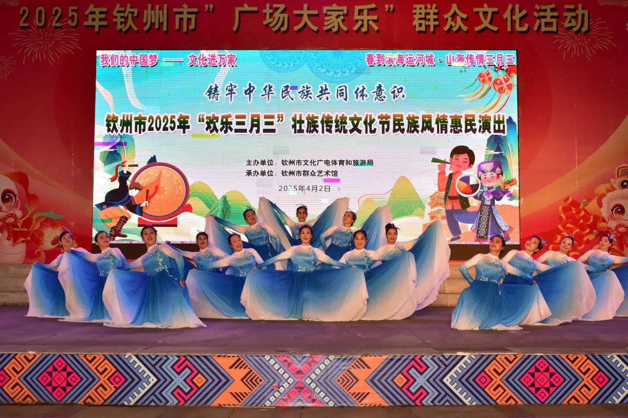 4月2日晚,钦州湾广场上星光璀璨,欢声笑语不断。由钦州市文化广电体育和旅游局主办、钦州市群众艺术馆承办的2025年钦州市“广场大家乐”群众文化活动暨“欢乐三月三”壮族传统文化节民族风情惠民演出在这里热烈举行。此次活动以“春到滨海运河城·山海传情三月三”为主题,展现了钦州丰富的民族文化与传统魅力。当晚8点,演出在开场歌舞《三月三九月九》中拉开帷幕,悠扬的旋律和动感的舞姿将观众带入了壮族文化的独特氛围。紧接着的多个节目,演员们优美的舞姿与激昂的歌声交织在一起,将钦州的浓厚人文氛围展现得淋漓尽致。