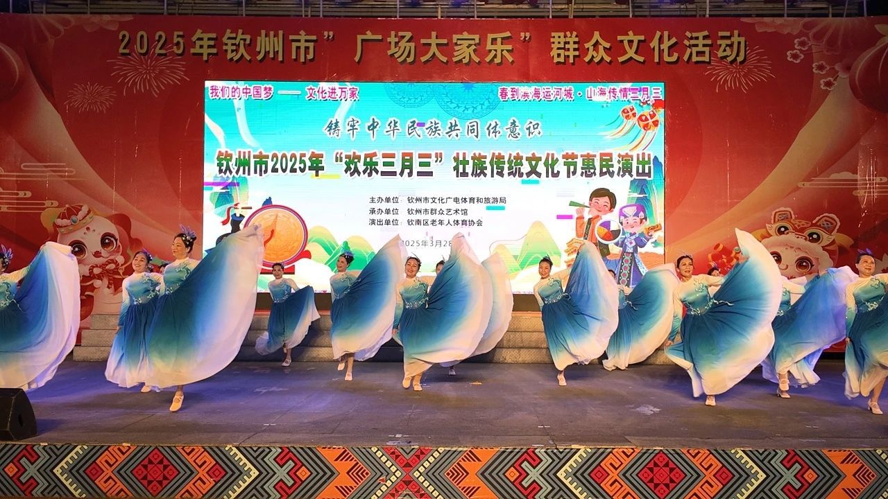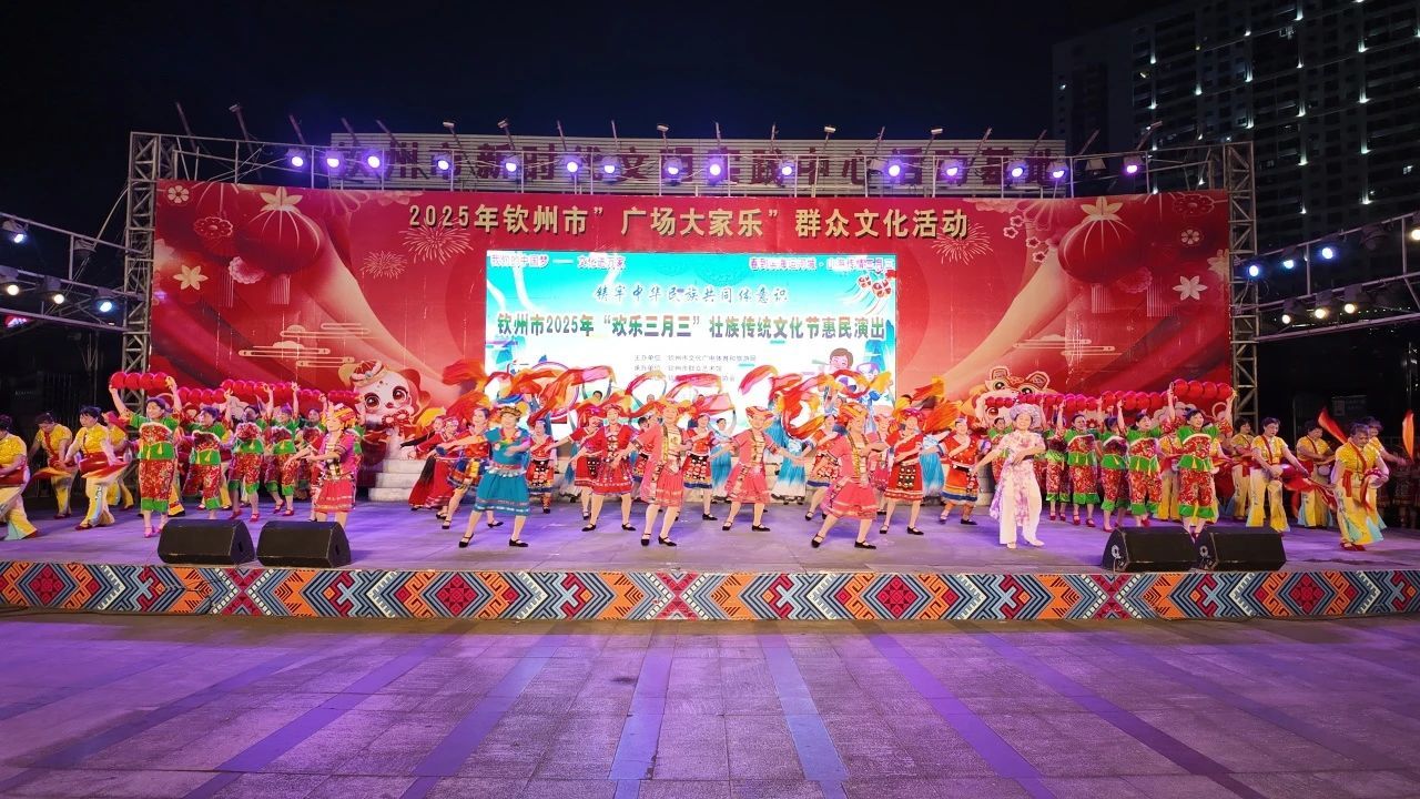 3月28日晚,钦州湾广场“大家乐”舞台上,热闹非凡,温暖的灯光洒满整个广场。钦州市文化广电体育和旅游局主办的“欢乐三月三”壮族传统文化节惠民演出盛大举行,吸引了众多市民前来观看,庆祝壮族的传统节日,感受浓郁的文化气息。