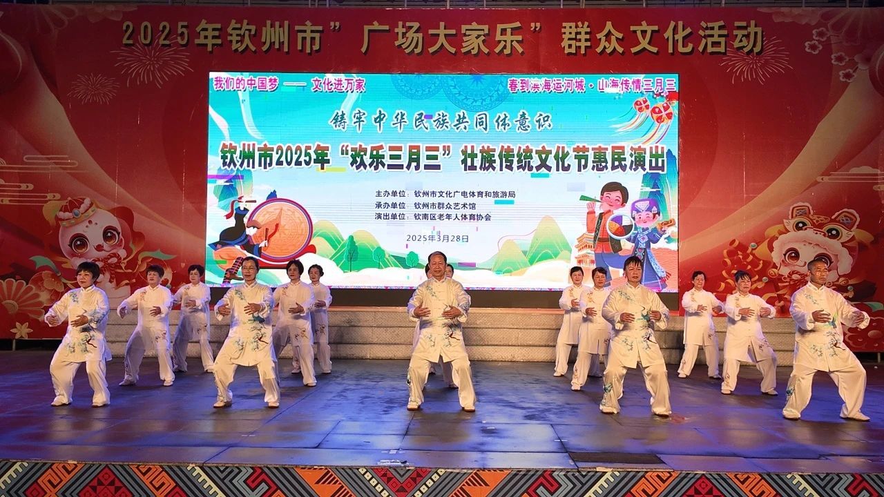 本次演出由钦州市群众艺术馆承办,钦南区老年人体育协会积极参与,充分展现了老年团体的活力与创造力。活动的主题为“春到滨海运河城·山海传情三月三”,充分体现出钦州作为滨海城市的独特魅力以及壮族文化的深厚底蕴。演出在充满节日气氛的开场舞《欢聚一堂》中拉开帷幕,热情的舞者们用活力四射的舞姿点燃了现场的气氛,观众们的欢呼声此起彼伏。演出安排丰富多彩,包括精彩的舞蹈、戏曲表演、传统乐器演奏等,彰显了钦州市民的文化自信。