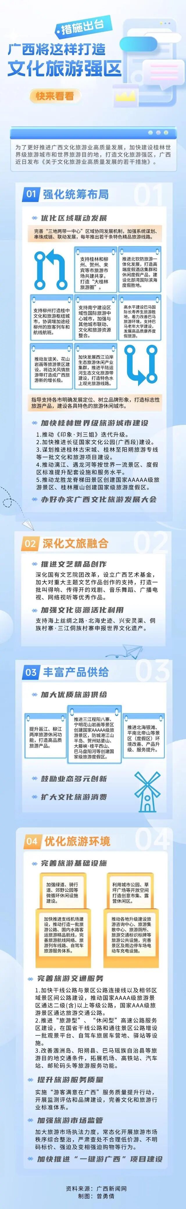 三是创新文旅融合促进机制。提出塑造广西文化旅游故事IP、形象IP、产品IP,鼓励全区各县(市、区)实施“六个一批”行动,打造一批高品质景区(度假区)、一批特色度假酒店(精品民宿)、一批特色旅游商品(系列)、一批特色美食、一批特色文化旅游活动。